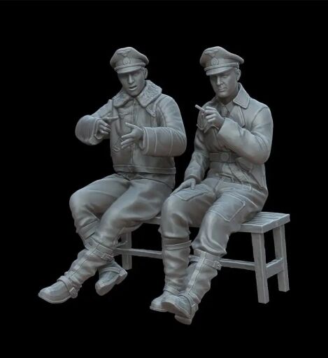 Zestaw figurek w skali 1:72 przedstawia dwóch niemieckich pilotów Luftwaffe siedzących na ławce w spokojnej, nieformalnej scenie rozmowy lub odpoczynku. Postacie ubrane są w lotnicze kurtki i umundurowanie typowe dla późnego okresu II wojny światowej.
